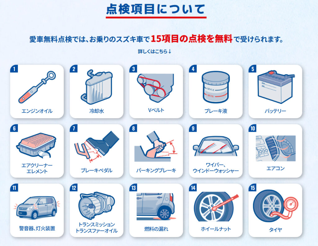 新着情報 NEWS カテゴリー 選択する すべてのお知らせ ブログ ニュース アーカイブ 選択する 2025年12月 2025年11月 2025年10月 2025年9月 2025年8月 2025年4月 2024年12月 2024年11月 2024年7月 2024年5月 2024年4月 2024年3月 2024年1月 2023年12月 2023年11月 2023年10月 2023年9月 2023年7月 2023年6月 2023年5月 2023年4月 2023年1月 2022年12月 2022年11月 2022年10月 2022年9月 2022年8月 2022年7月 2022年6月 2022年5月 2022年4月 2022年3月 2022年2月 2022年1月 2021年12月 2021年11月 2021年9月 2021年8月 2021年7月 2021年6月 2021年3月 2021年1月 2020年12月 2025.09.24 ブログ ★スズキ愛車無料点検★実施中! ただいま、CMでおなじみのスズキ愛車無料点検を実施中です! 2023年以前に登録・届出のスズキ車が対象となります。 当店をはじめてご利用されるお客様でももちろん大歓迎! スズキの車にいつも安心して乗っていただきたいから。 プロの整備士が安心の基本となる15項目をきめ細やかに無料で点検します! この機会にぜひご来店ください! 期間:2025年9月~11月末日 ※ 2024年以降登録・届出車両およびスズキ安心メンテナンスパック加入者は対象外となります。 PREV INDEX NEXT